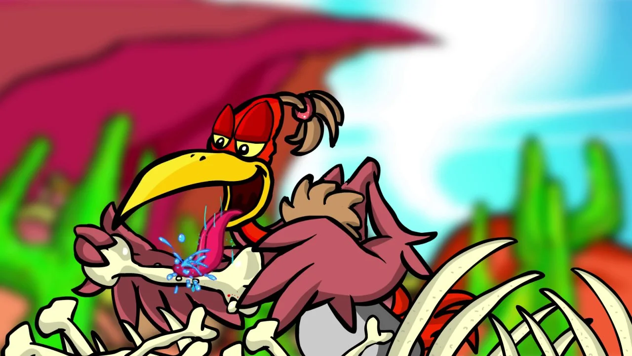 An animated cartoon by Charlie Kothe about a bird who bites off more than he can chew.